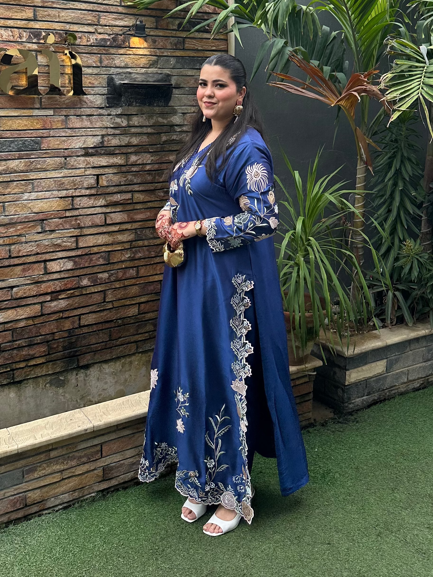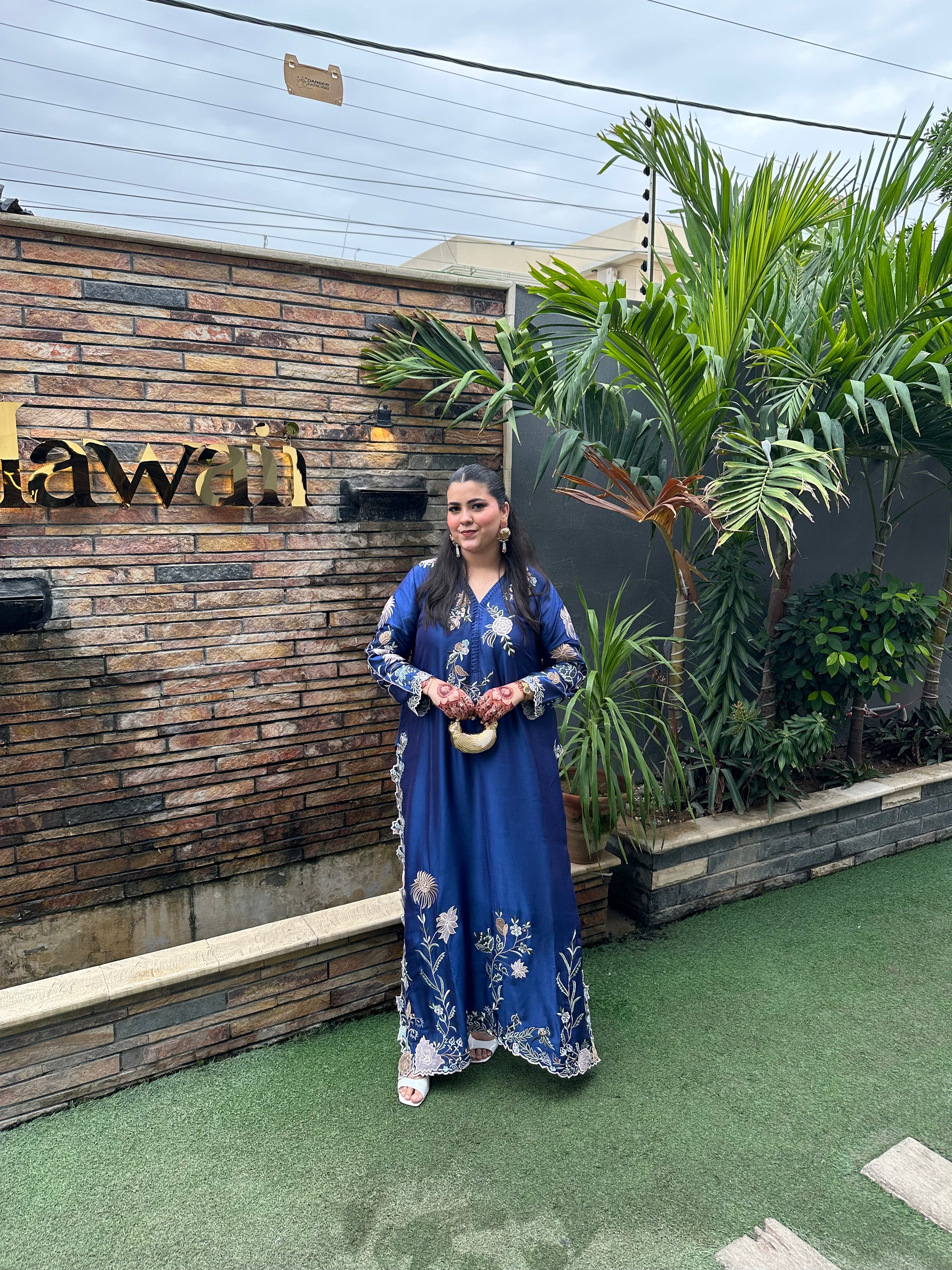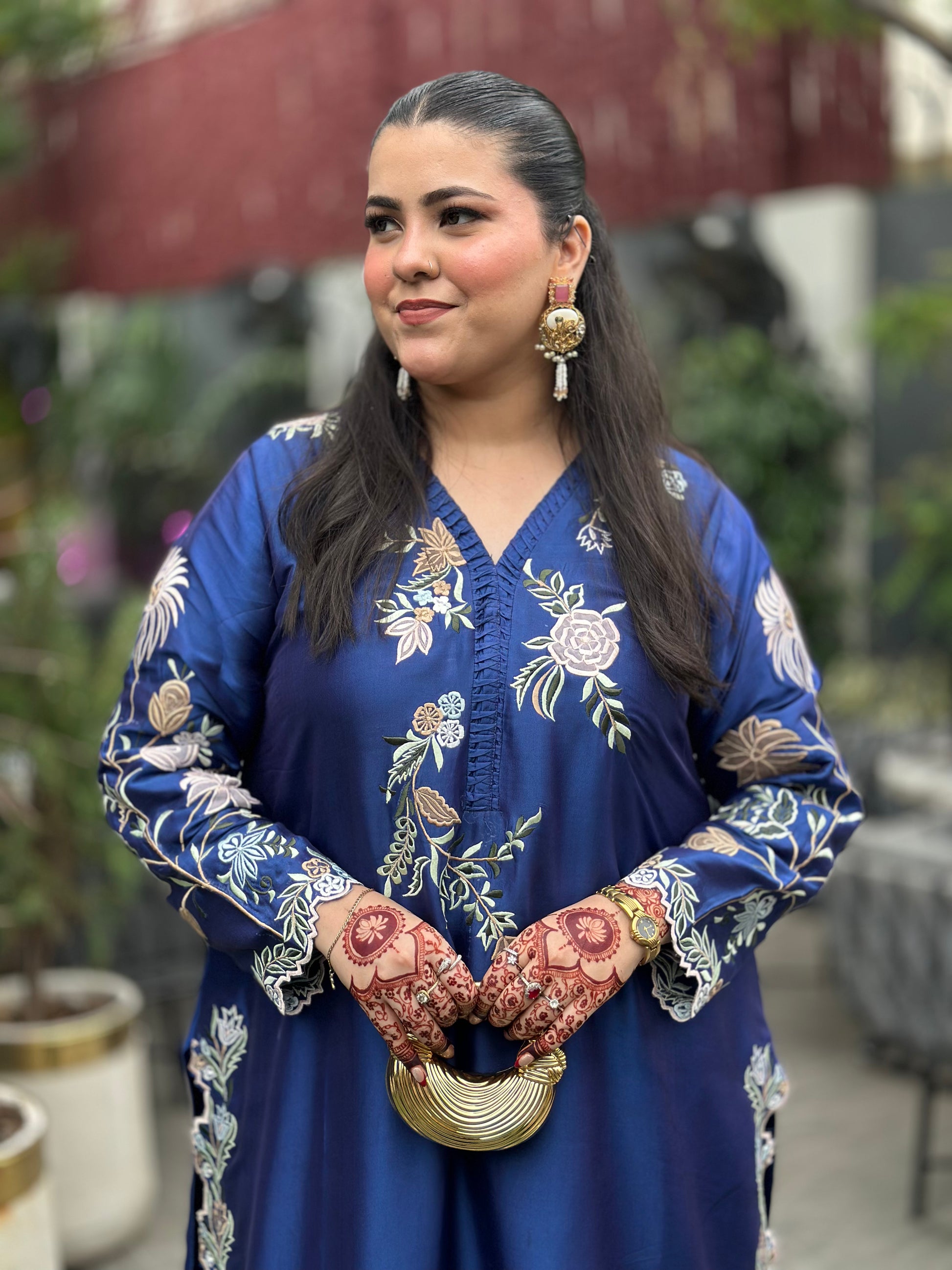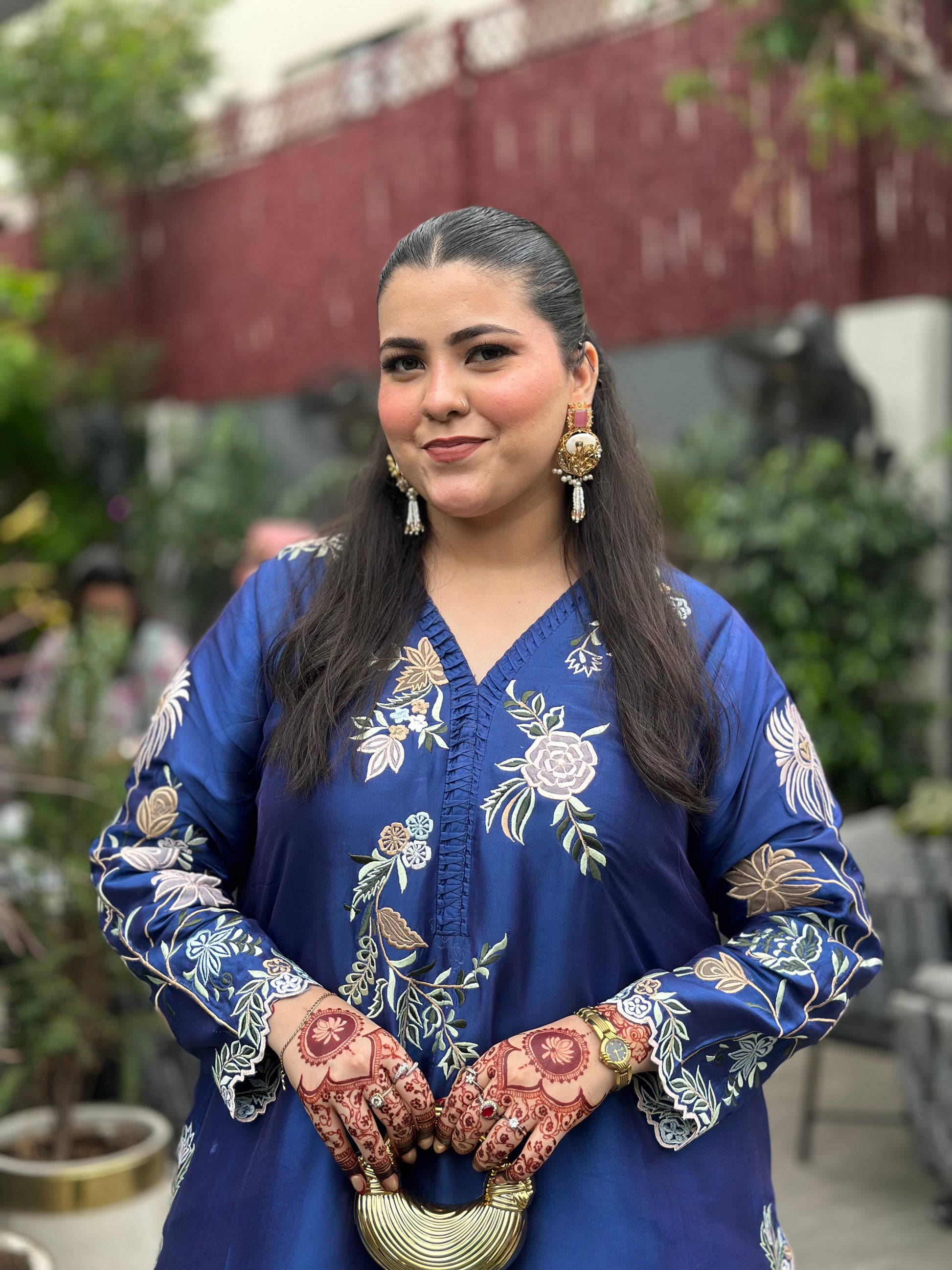 A bold royal blue long kaftan paired with straight pants, crafted in pure Sheesha silk for an effortlessly graceful look. The kaftan features delicate machine embroidery that adds a refined touch of elegance, making it perfect for both day and evening wear.